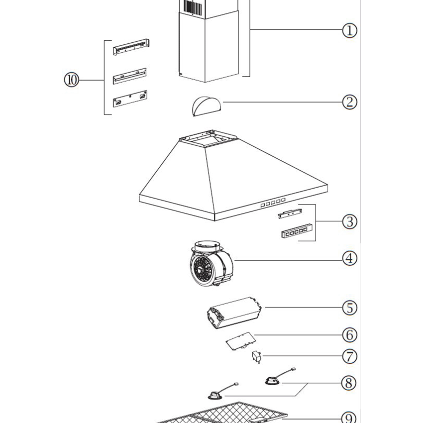 Common parts from model Broan BWP2244SS 24-Inch Convertible Wall-Mount Pyramidal Chimney Range Hood, 450 MAX CFM, Stainless Steel